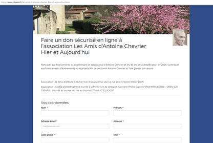 Afin de soutenir l’organisation de cette année jubilaire, il est possible de contribuer par un don. L’Association Les Amis d’Antoine Chevrier Hier et Aujourd’hui, créée il y a deux ans à l’initiative de la Famille spirituelle pradosienne, est chargée de recueillir les dons et d’en assurer le suivi administratif. Un compte rendu financier sera présenté à la fin de l’année jubilaire.