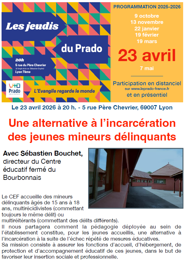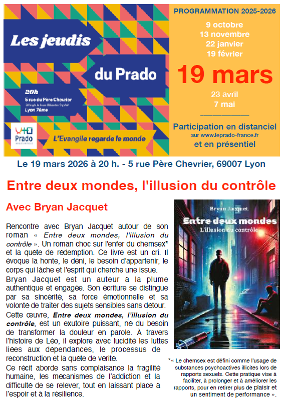 Pour bien commencer l’année 2026, la Famille du Prado vous propose de nous retrouver Jeudi 22 janvier à 20h en présentiel (5, rue père Chevrier – Lyon 7) ou en Visio (lien prochainement en ligne) dans le cadre des Jeudis du Prado.