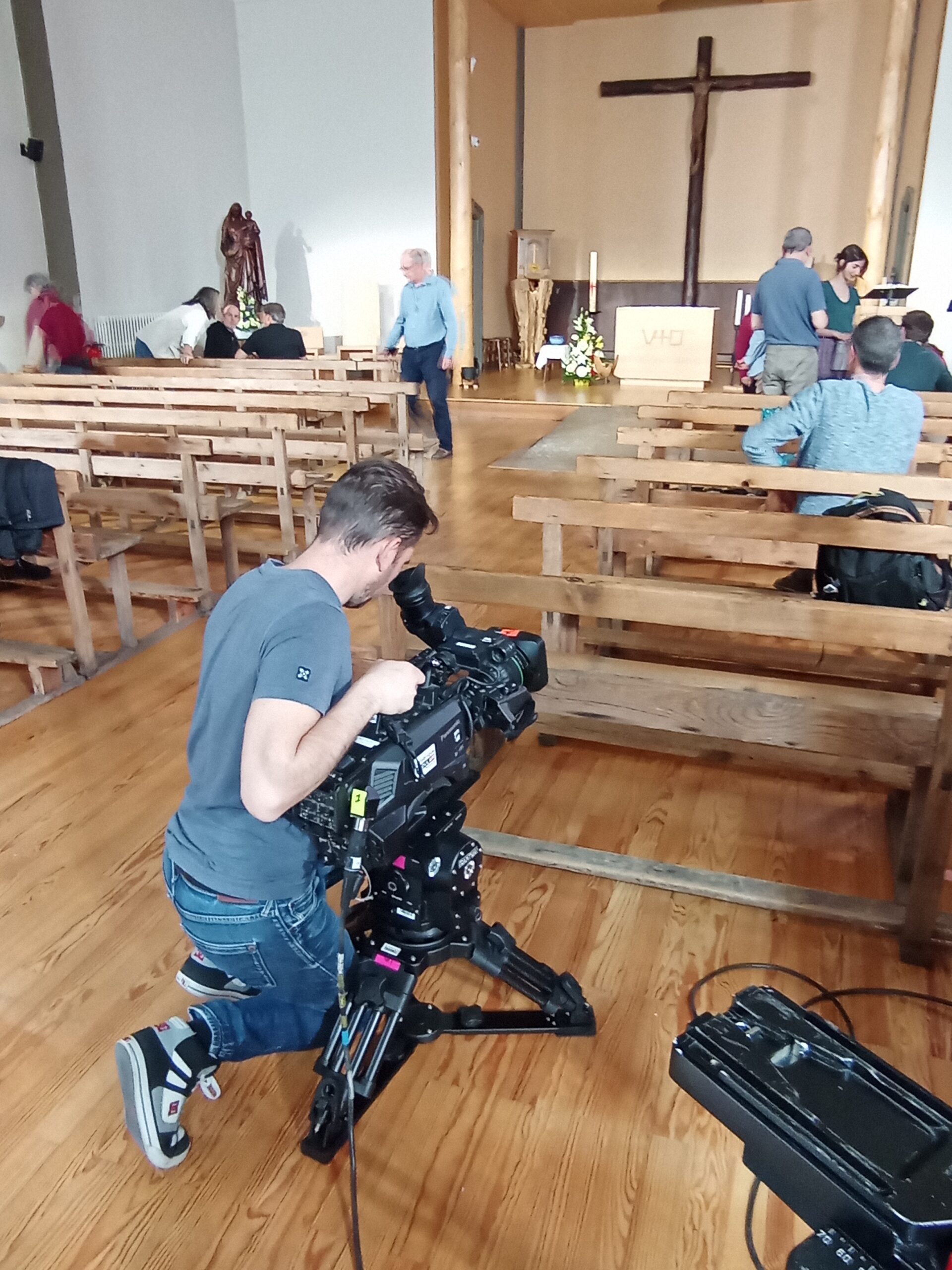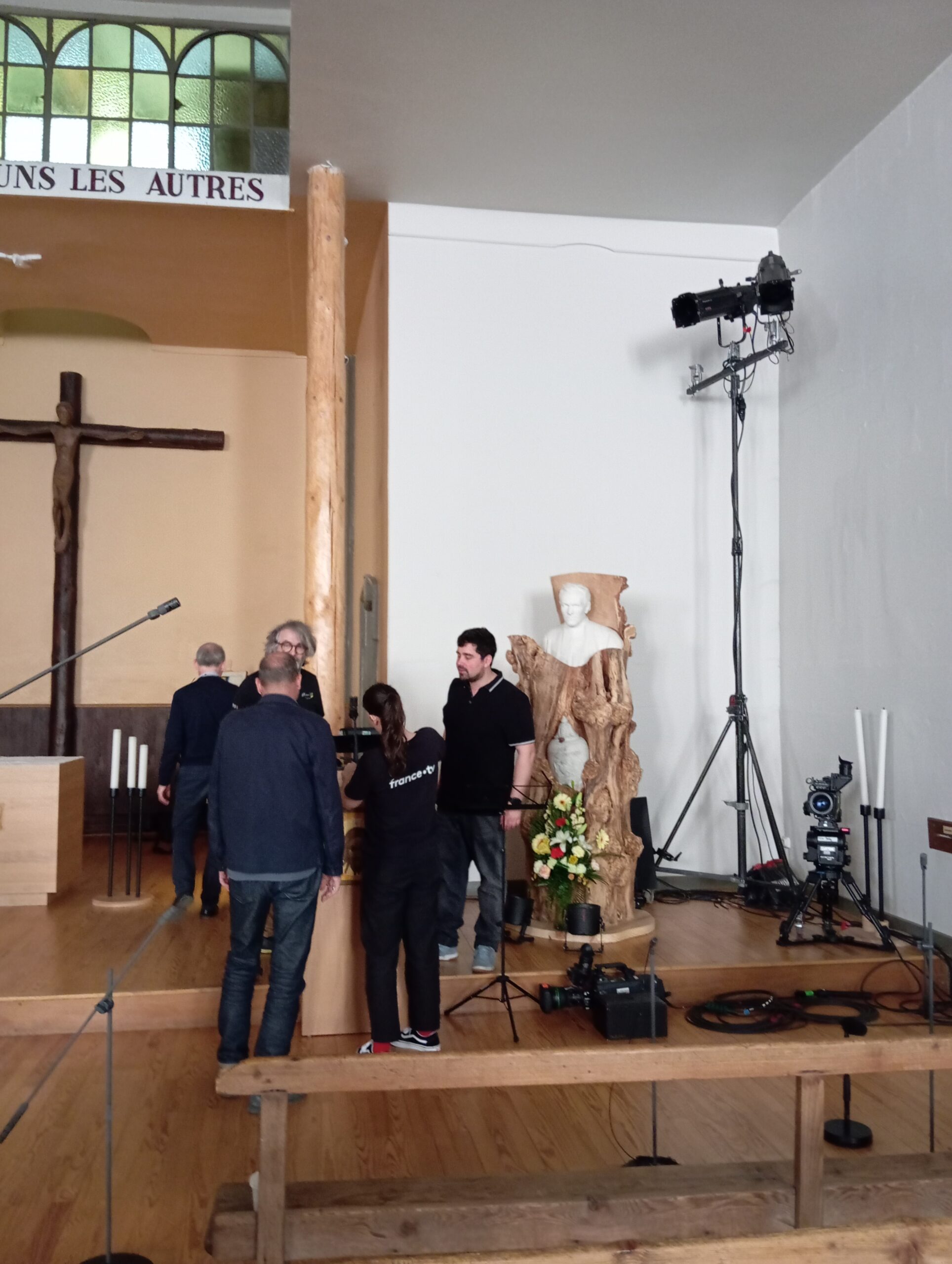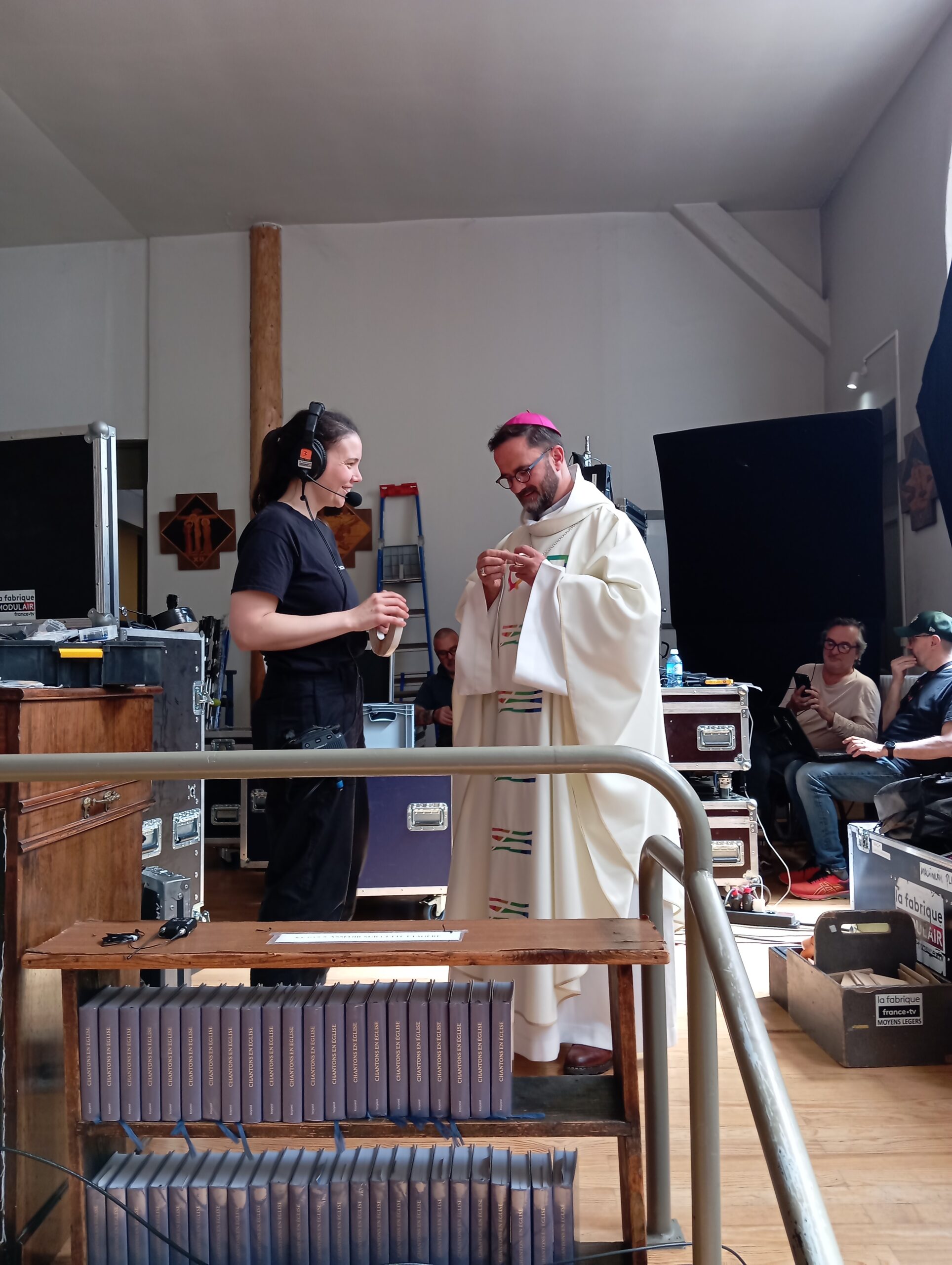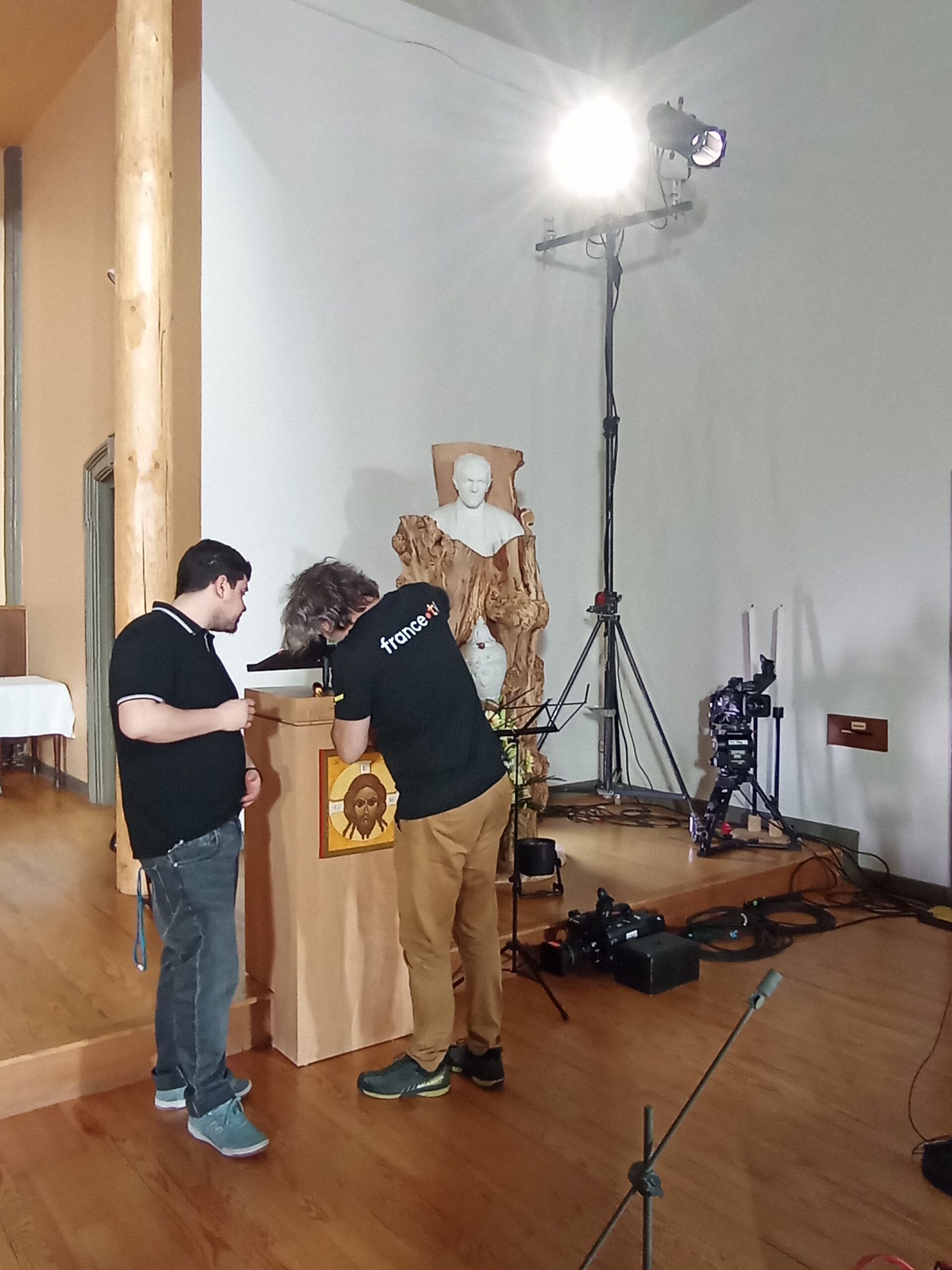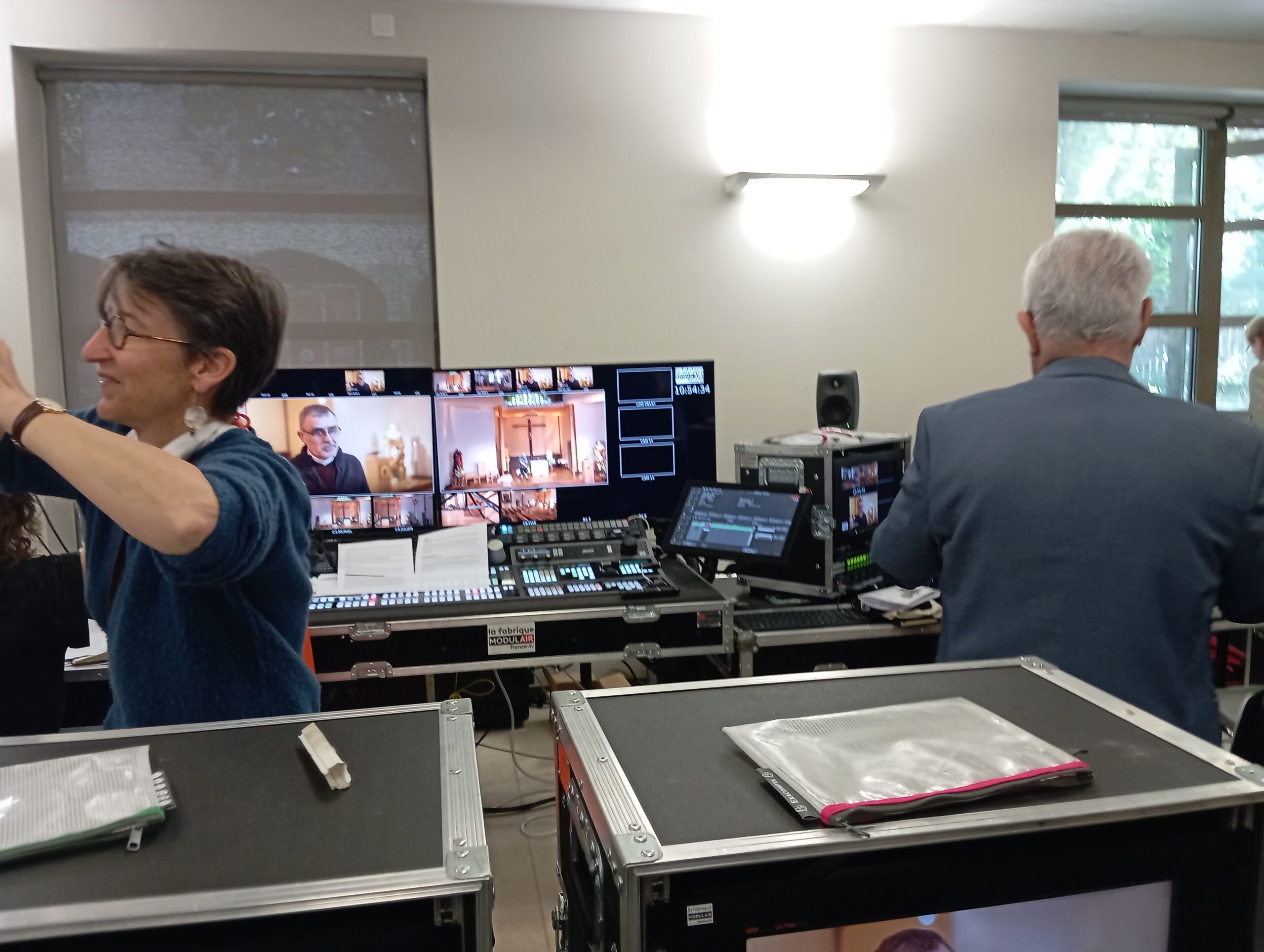 Samedi après-midi, rendez-vous OPV*, un temps de mise en place en présence de Mgr Loïc LAGADEC, du père Diego MARTÍN PEÑAS (Responsable des prêtres et laïcs consacrés du Prado), de sœur Nora (Responsable des sœurs du Prado), de Pim (Pilar QUERALT CAPDEVILA, Responsable de l’IFP), des célébrants (les pères Luc LALIRE, Dominique NALIS, Jean-Yves LEBORGNE…), des lecteurs, de la chorale et de la Famille du Prado. Un moment précieux où chacun ajuste sa place pour que la célébration soit vécue dans la justesse, la sérénité et l’unité.  et préparatifs avant la diffusion : rendez-vous avec l’OPV, briefing des équipes, puis tournage des images d’illustration avant le filage.