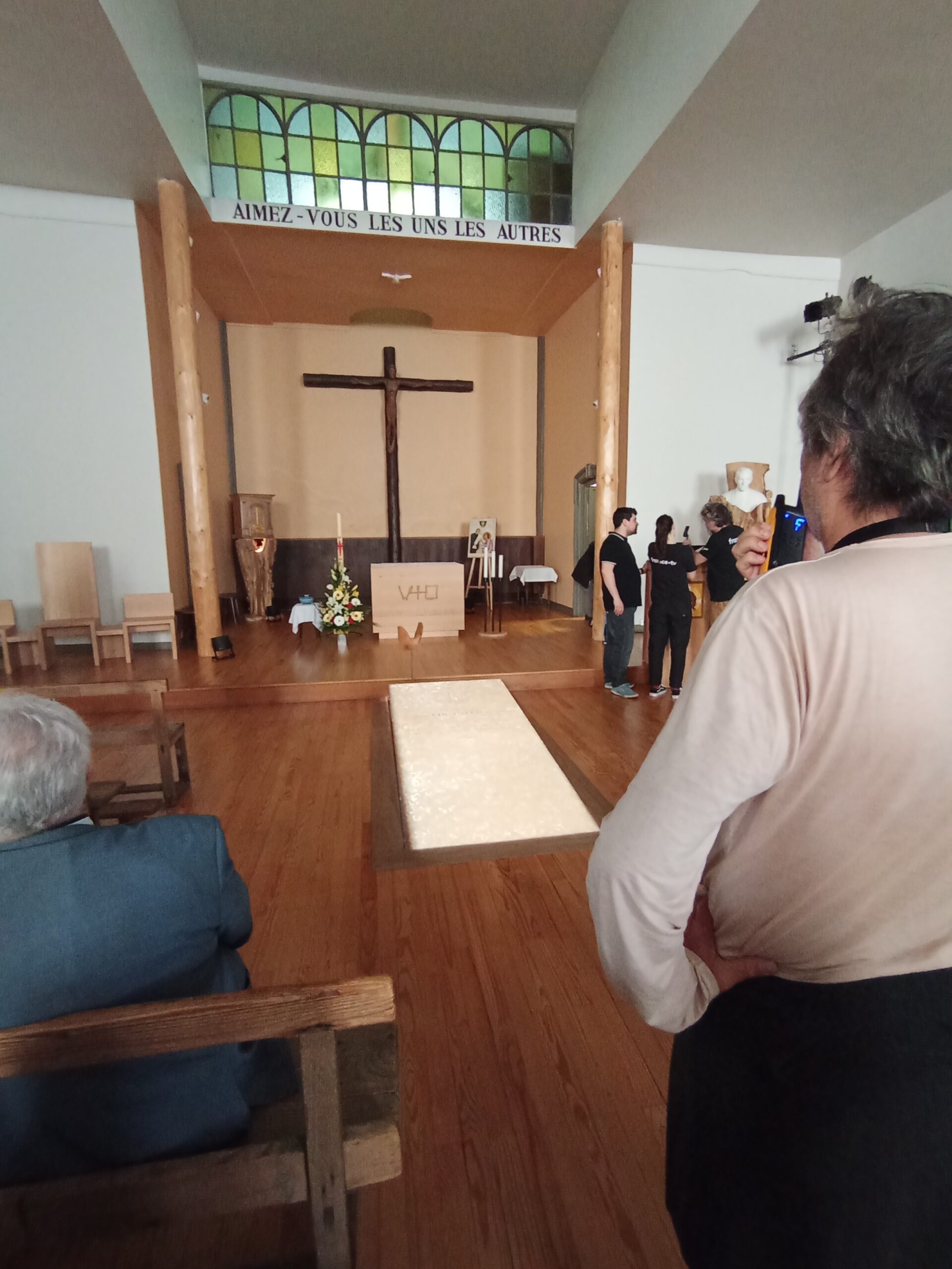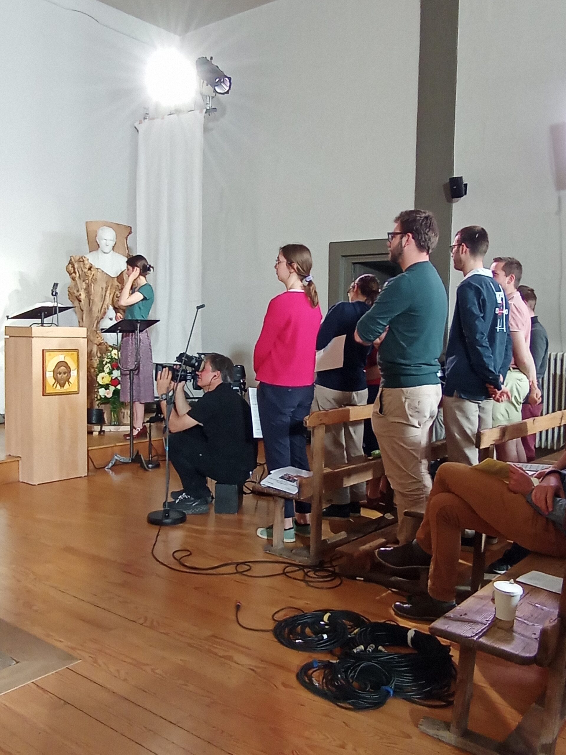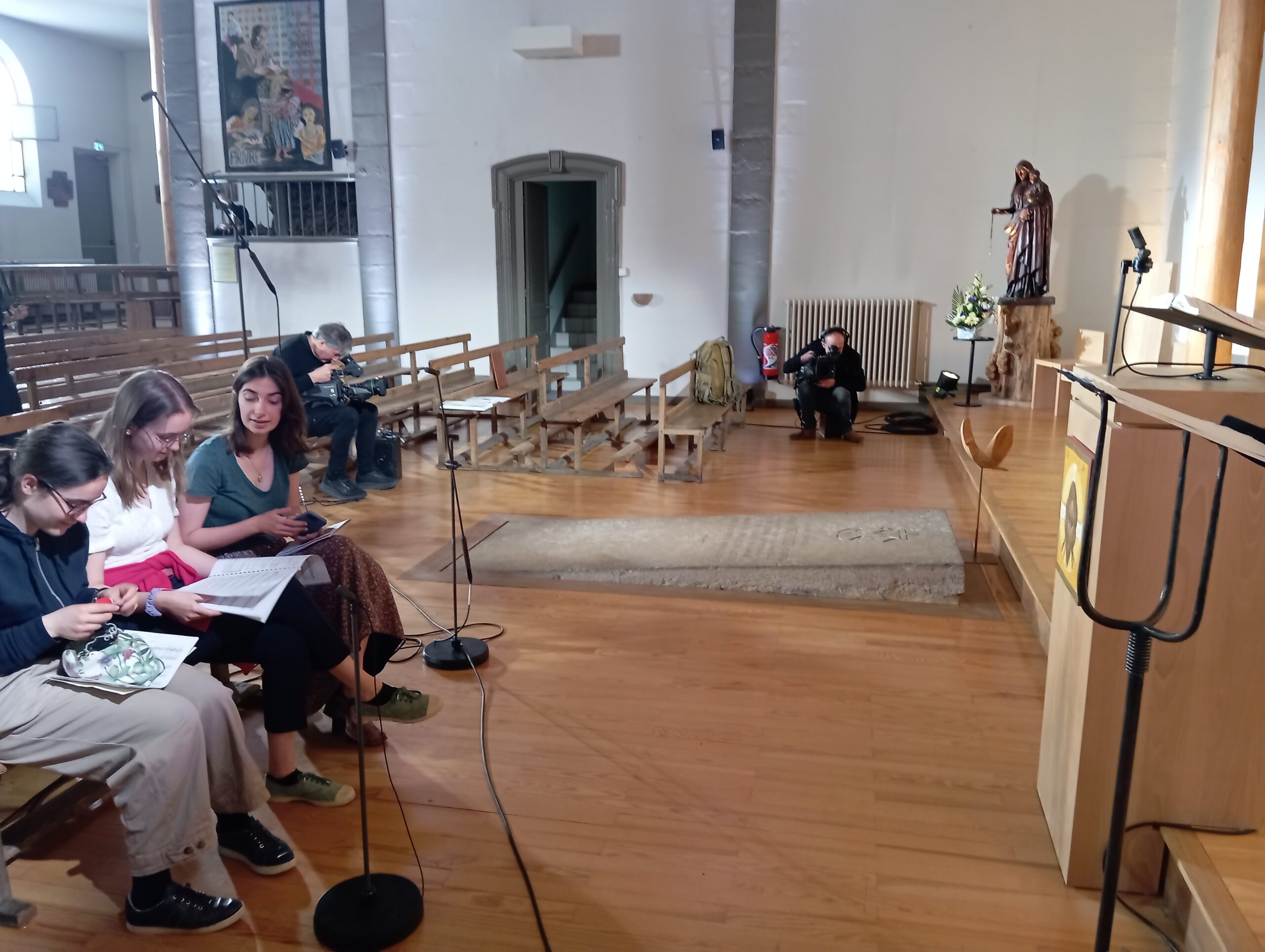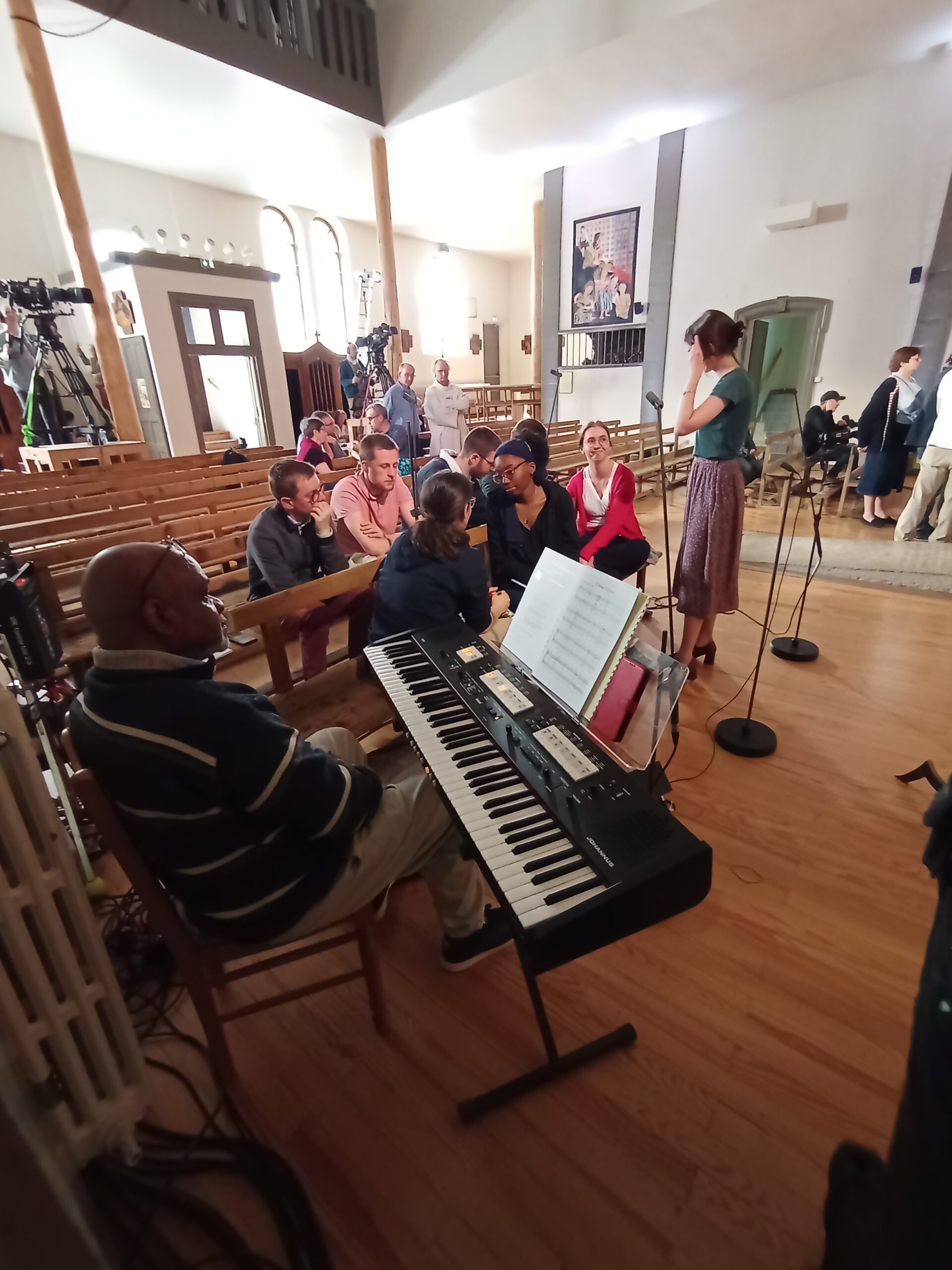 Samedi après-midi, rendez-vous OPV*, un temps de mise en place en présence de Mgr Loïc LAGADEC, du père Diego MARTÍN PEÑAS (Responsable des prêtres et laïcs consacrés du Prado), de sœur Nora (Responsable des sœurs du Prado), de Pim (Pilar QUERALT CAPDEVILA, Responsable de l’IFP), des célébrants (les pères Luc LALIRE, Dominique NALIS, Jean-Yves LEBORGNE…), des lecteurs, de la chorale et de la Famille du Prado. Un moment précieux où chacun ajuste sa place pour que la célébration soit vécue dans la justesse, la sérénité et l’unité.  et préparatifs avant la diffusion : rendez-vous avec l’OPV, briefing des équipes, puis tournage des images d’illustration avant le filage.