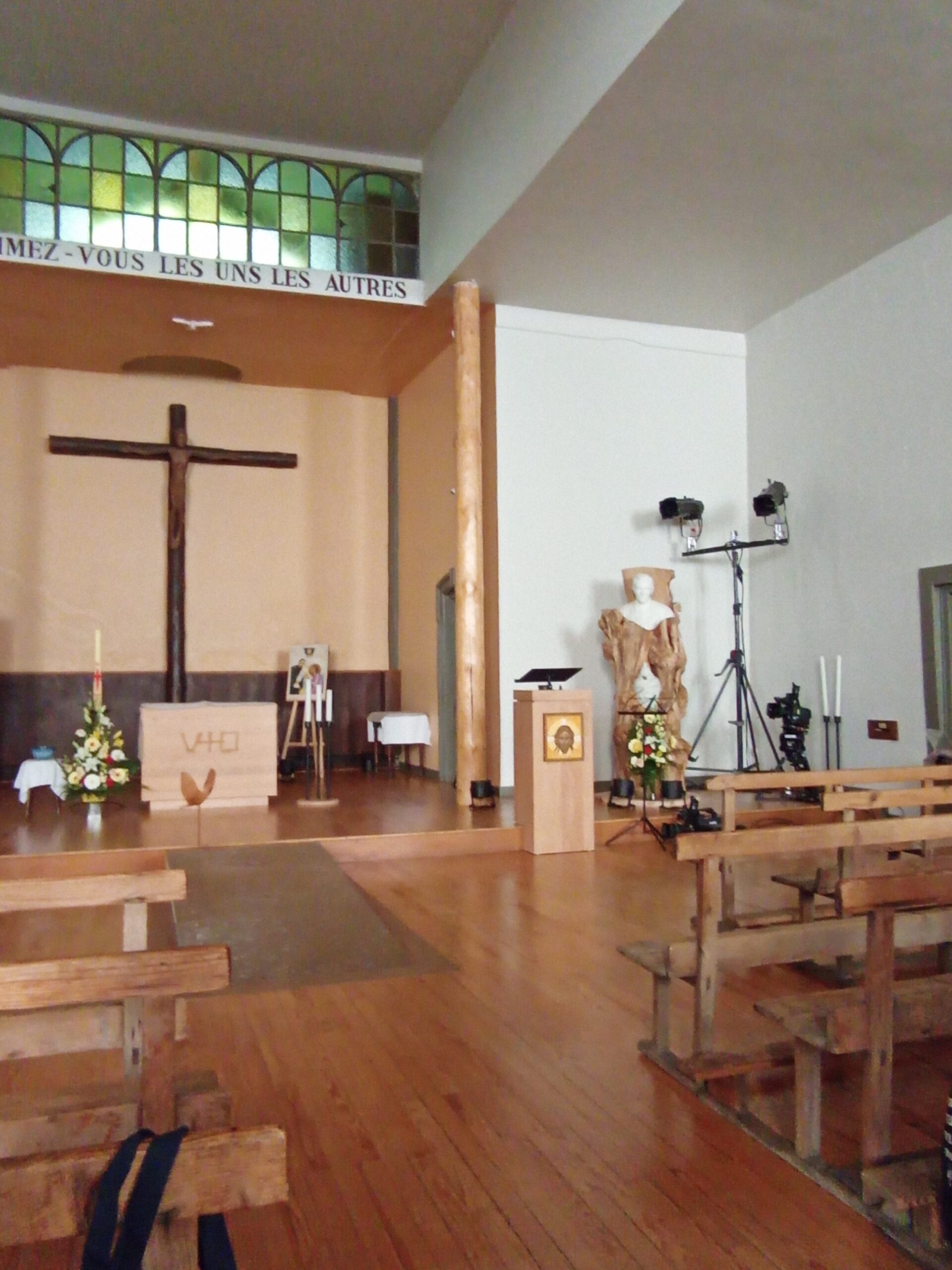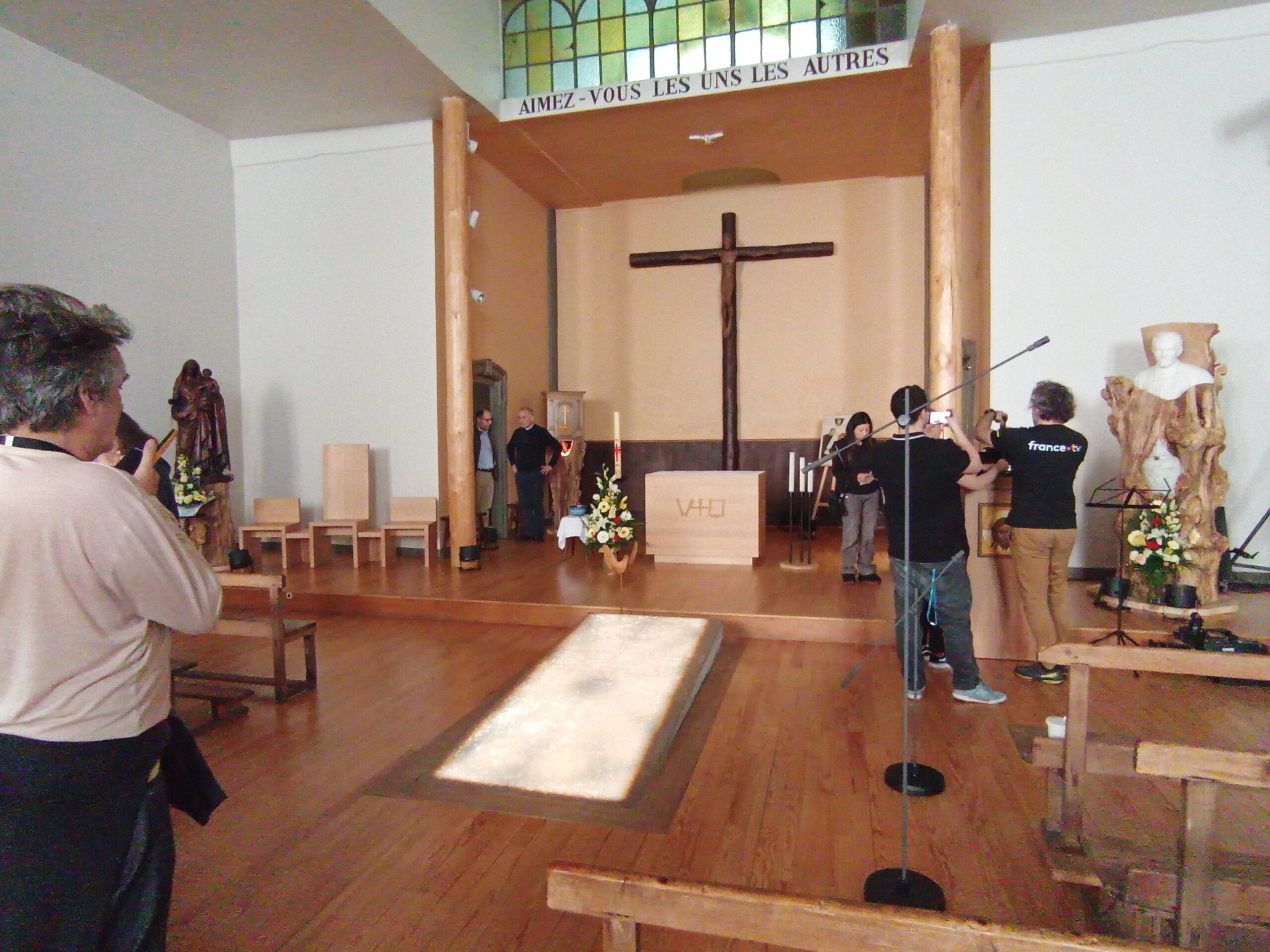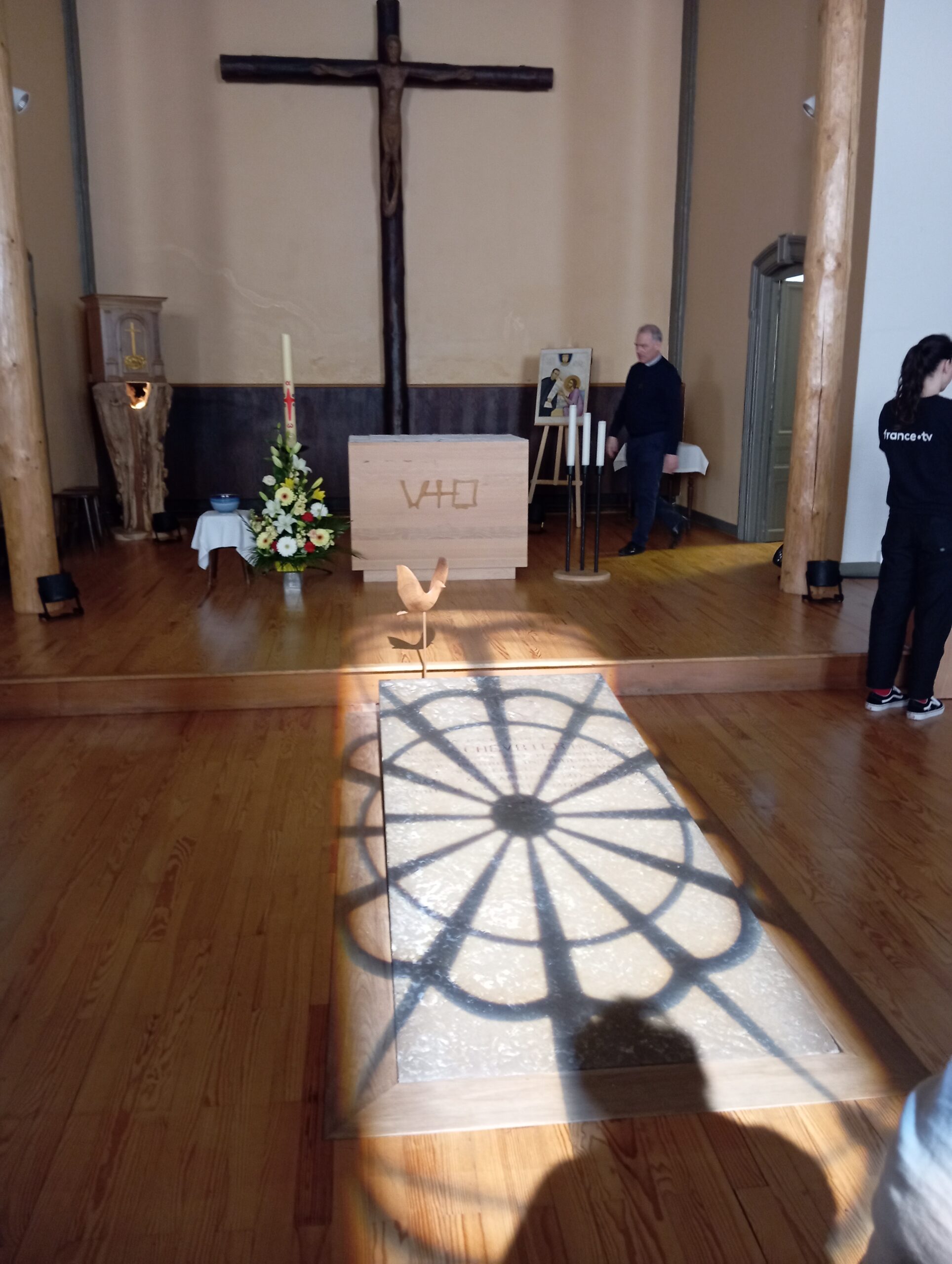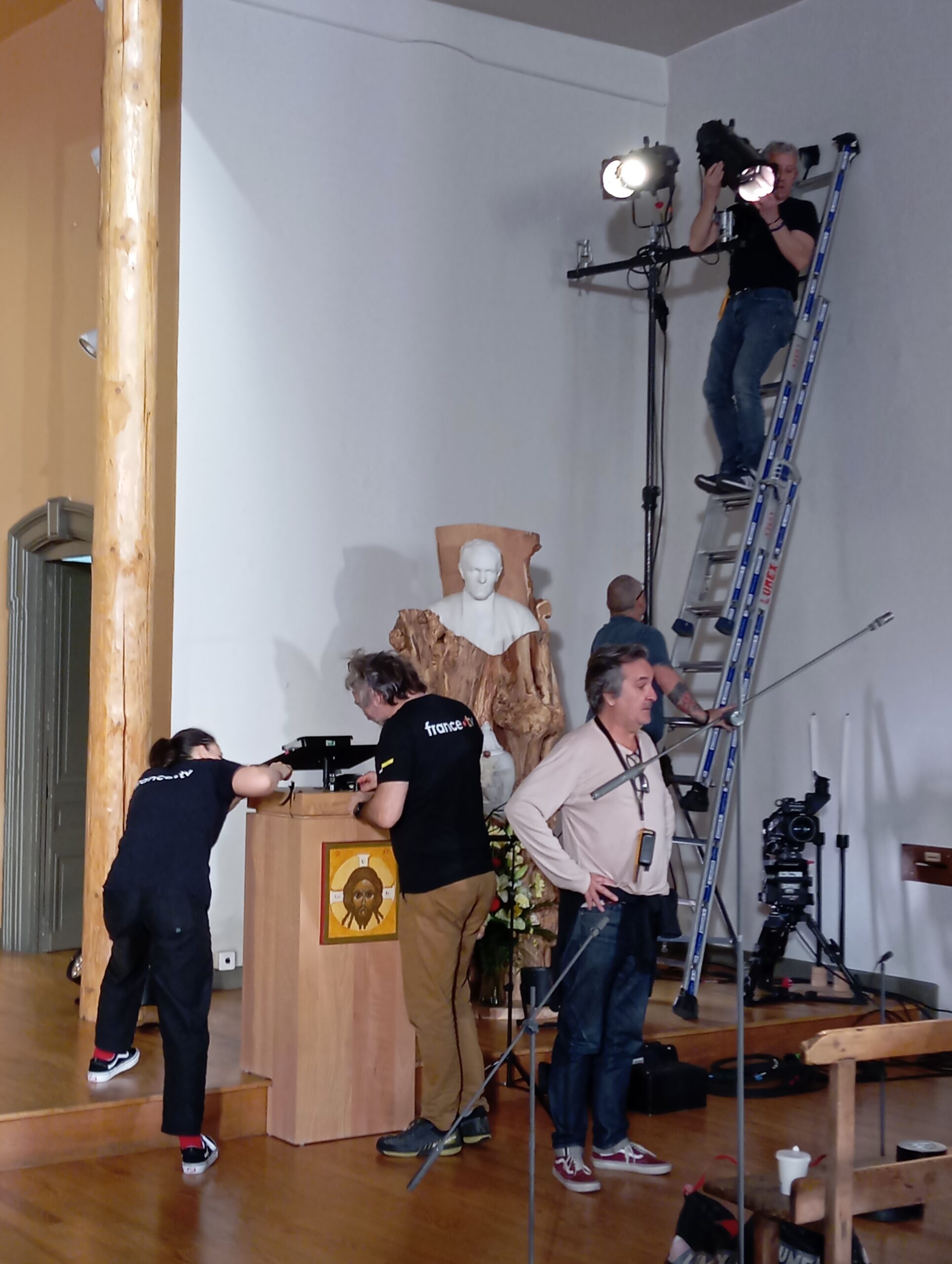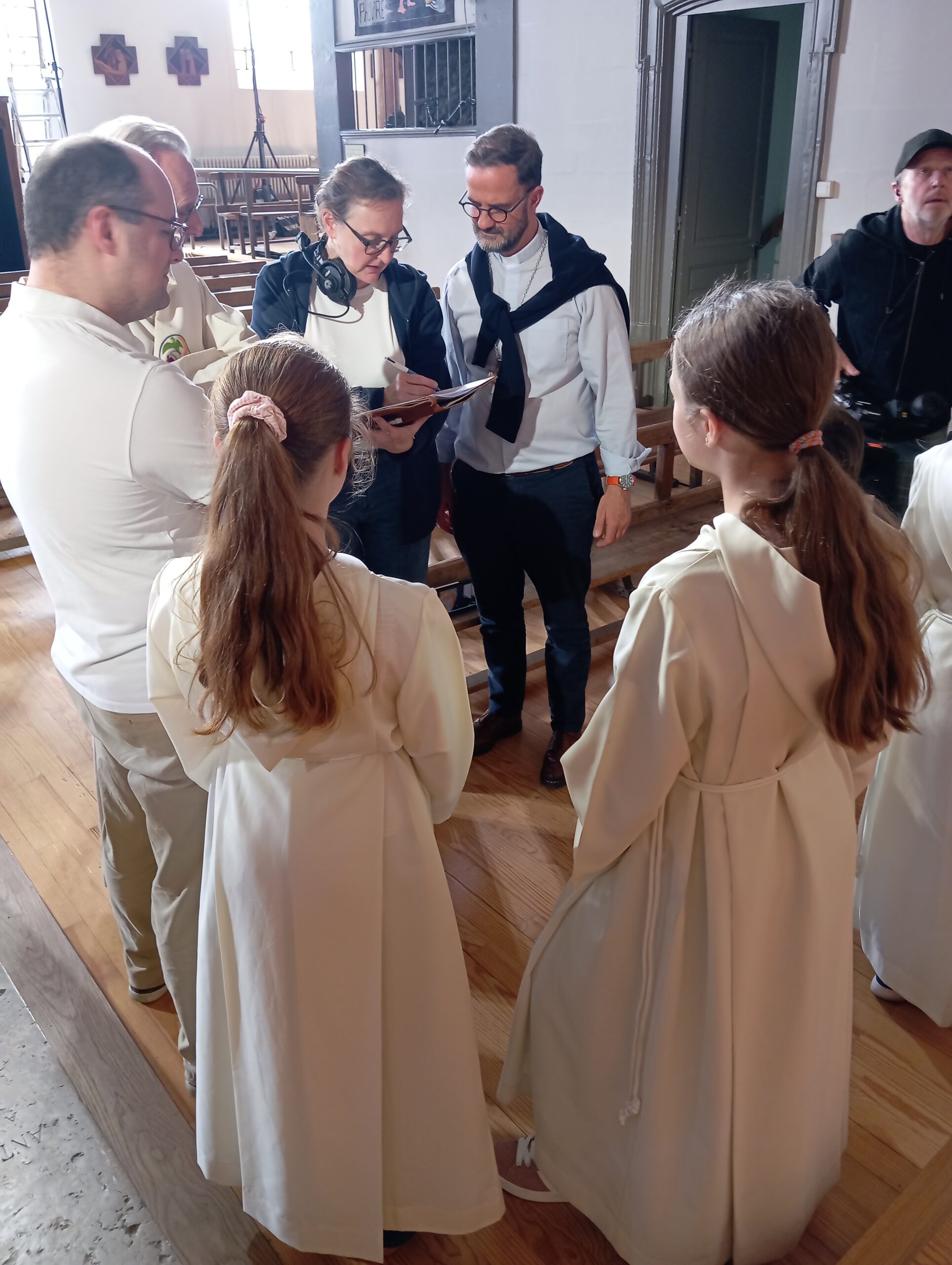 Samedi après-midi, rendez-vous OPV*, un temps de mise en place en présence de Mgr Loïc LAGADEC, du père Diego MARTÍN PEÑAS (Responsable des prêtres et laïcs consacrés du Prado), de sœur Nora (Responsable des sœurs du Prado), de Pim (Pilar QUERALT CAPDEVILA, Responsable de l’IFP), des célébrants (les pères Luc LALIRE, Dominique NALIS, Jean-Yves LEBORGNE…), des lecteurs, de la chorale et de la Famille du Prado. Un moment précieux où chacun ajuste sa place pour que la célébration soit vécue dans la justesse, la sérénité et l’unité.  et préparatifs avant la diffusion : rendez-vous avec l’OPV, briefing des équipes, puis tournage des images d’illustration avant le filage.