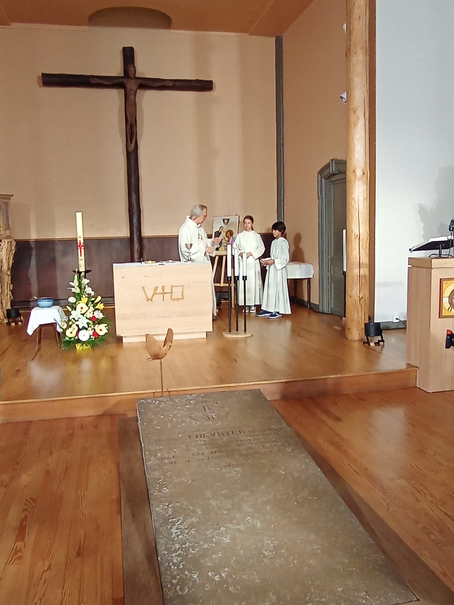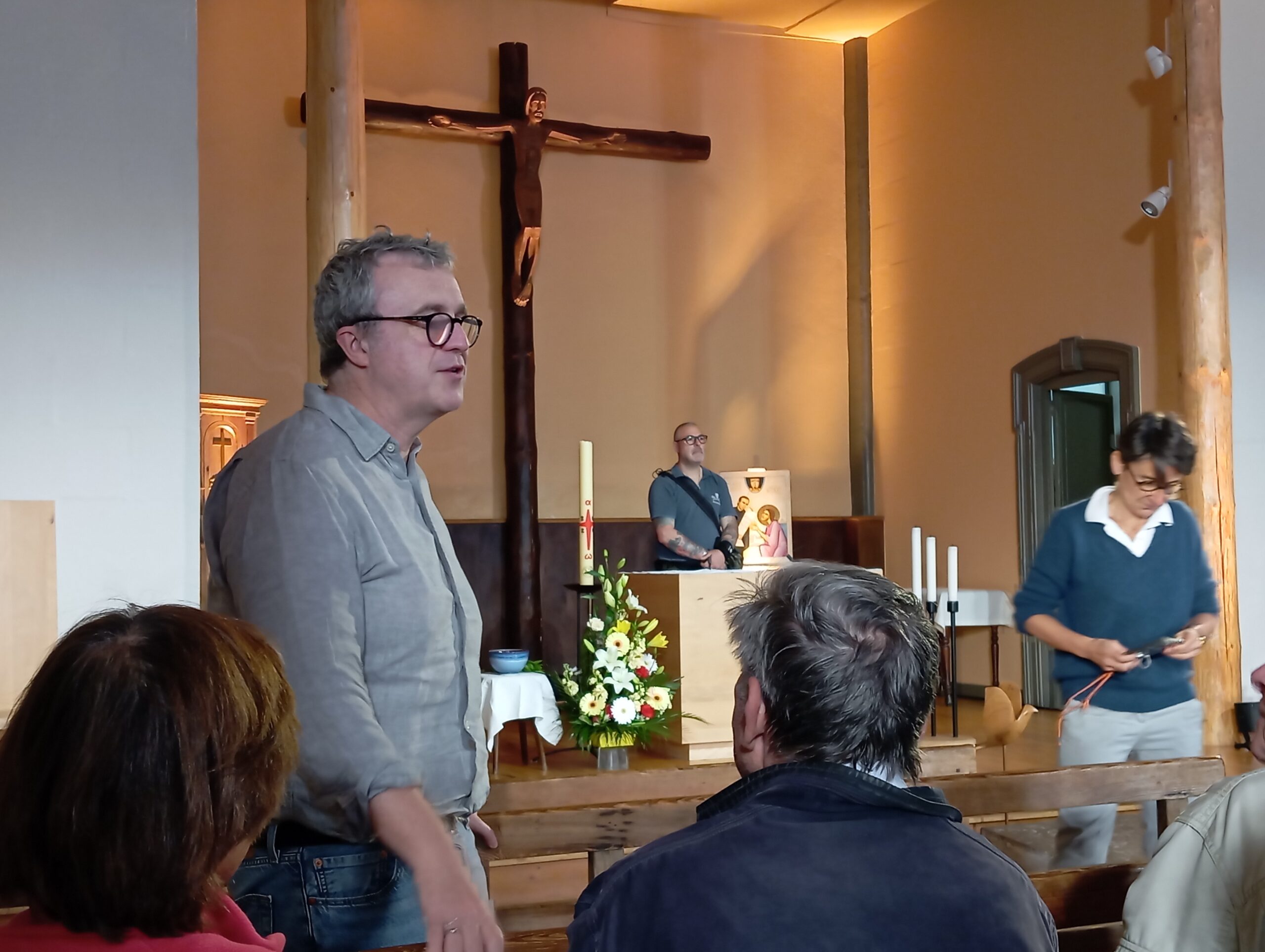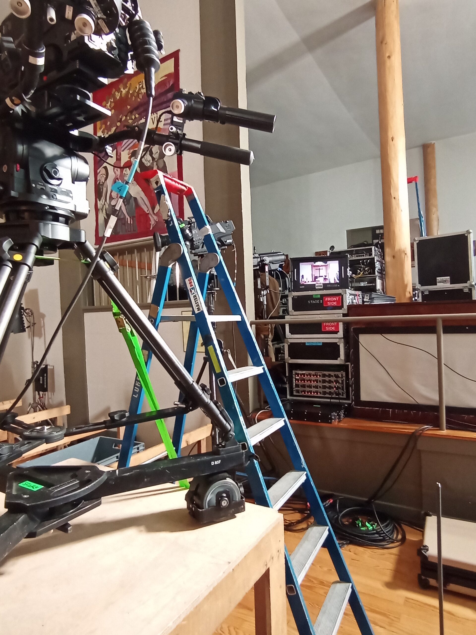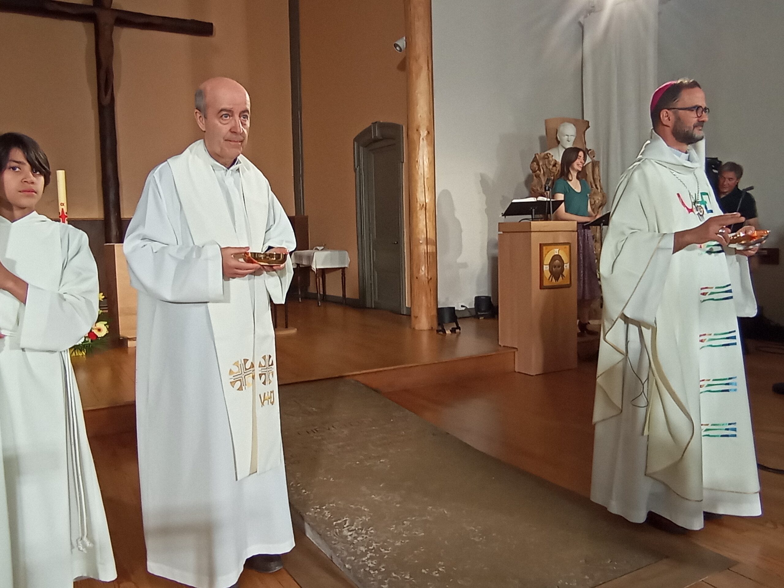 Samedi après-midi, rendez-vous OPV*, un temps de mise en place en présence de Mgr Loïc LAGADEC, du père Diego MARTÍN PEÑAS (Responsable des prêtres et laïcs consacrés du Prado), de sœur Nora (Responsable des sœurs du Prado), de Pim (Pilar QUERALT CAPDEVILA, Responsable de l’IFP), des célébrants (les pères Luc LALIRE, Dominique NALIS, Jean-Yves LEBORGNE…), des lecteurs, de la chorale et de la Famille du Prado. Un moment précieux où chacun ajuste sa place pour que la célébration soit vécue dans la justesse, la sérénité et l’unité.  et préparatifs avant la diffusion : rendez-vous avec l’OPV, briefing des équipes, puis tournage des images d’illustration avant le filage.