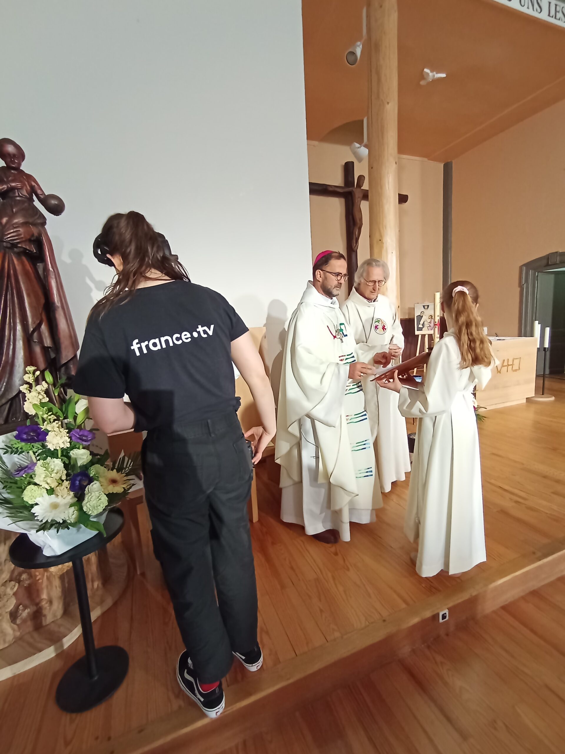 Mme Stéphanie Gugny, chargée de la liturgique Le Jour du Seigneur, en collaboration avec chaque paroisse, orchestre tout avec précision à partir d’un conducteur minuté, garantissant le bon déroulement des 90 minutes de direct de la messe. Pour la messe à la Chapelle du Prado, qui réunira une centaine de fidèles, 10 concélébrants vont entourer Mgr Loïc Lagadec, Evêque auxiliaire du diocèse de Lyon, qui présidera la messe. Mais l’assemblée va dépasser largement les murs de la chapelle puisqu’au-delà des « visibles », les présents sur place, il y aura les « invisibles », à savoir des centaines de milliers de « téléfidèles » derrière leurs écrans (environ 500 000 chaque dimanche).