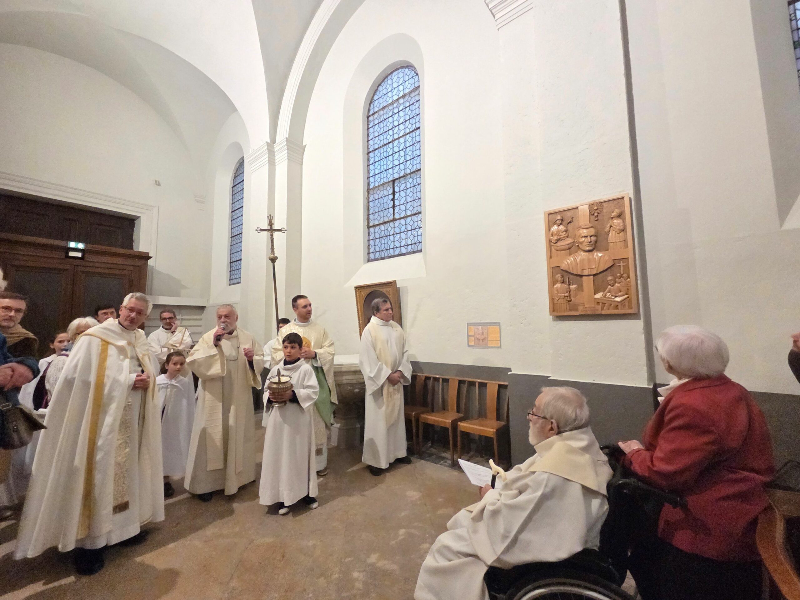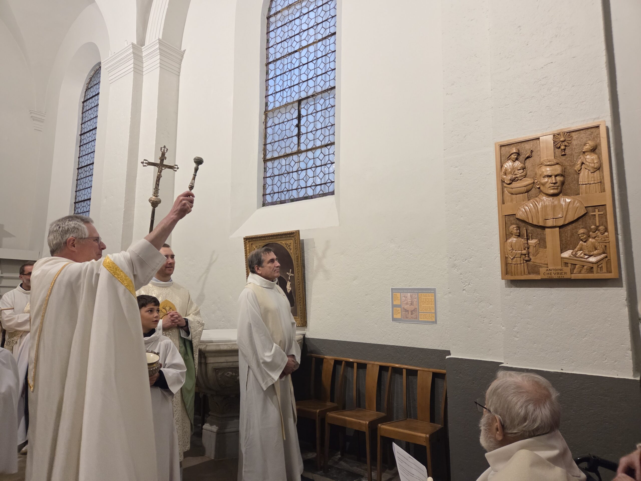 La célébration eucharistique, marquée par une évocation de l’enfance d’Antoine Chevrier, a précédé le dévoilement et la bénédiction de l’œuvre réalisée par Philippe Duret : un bas-relief évoquant la présence d’Antoine enfant en ce lieu.