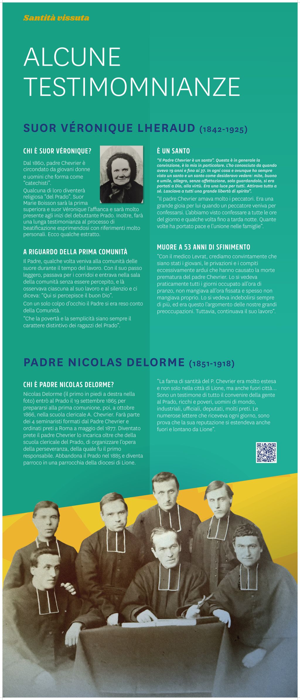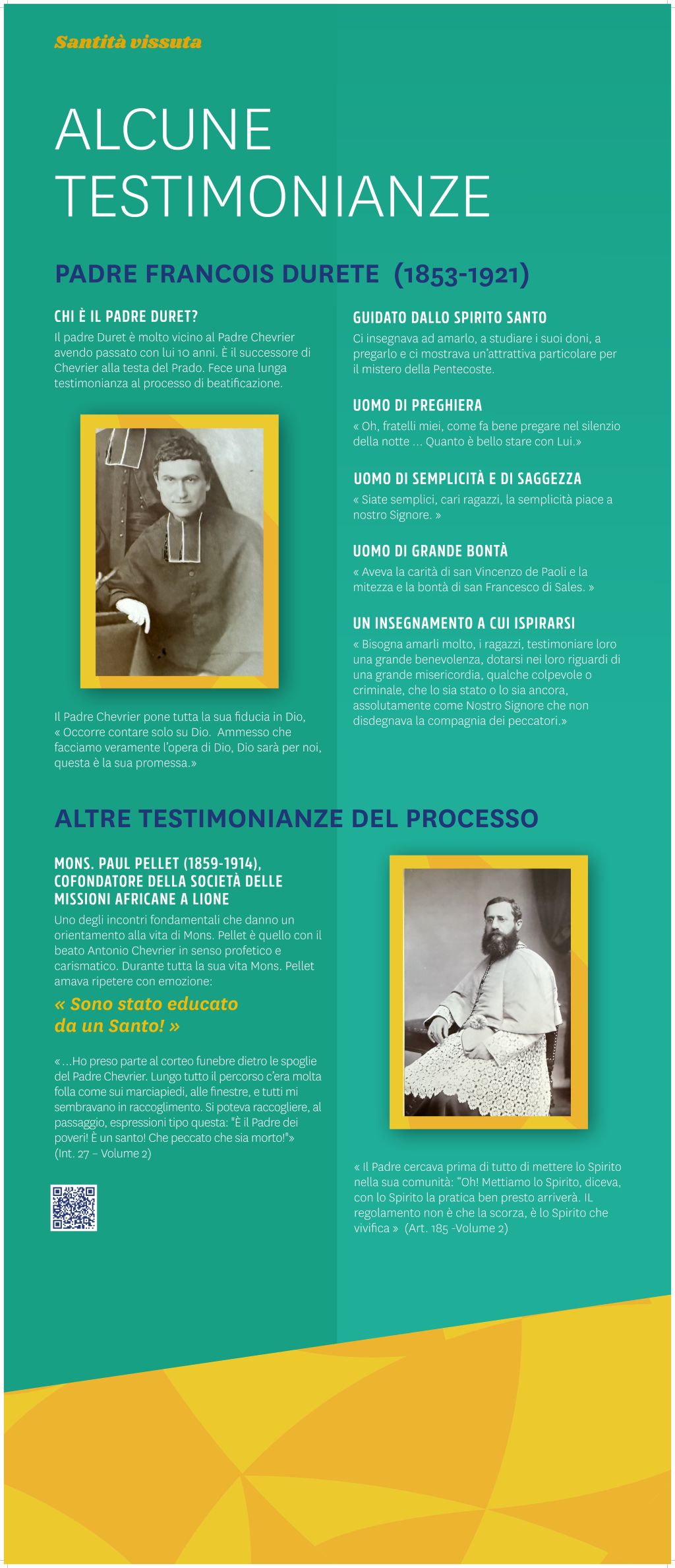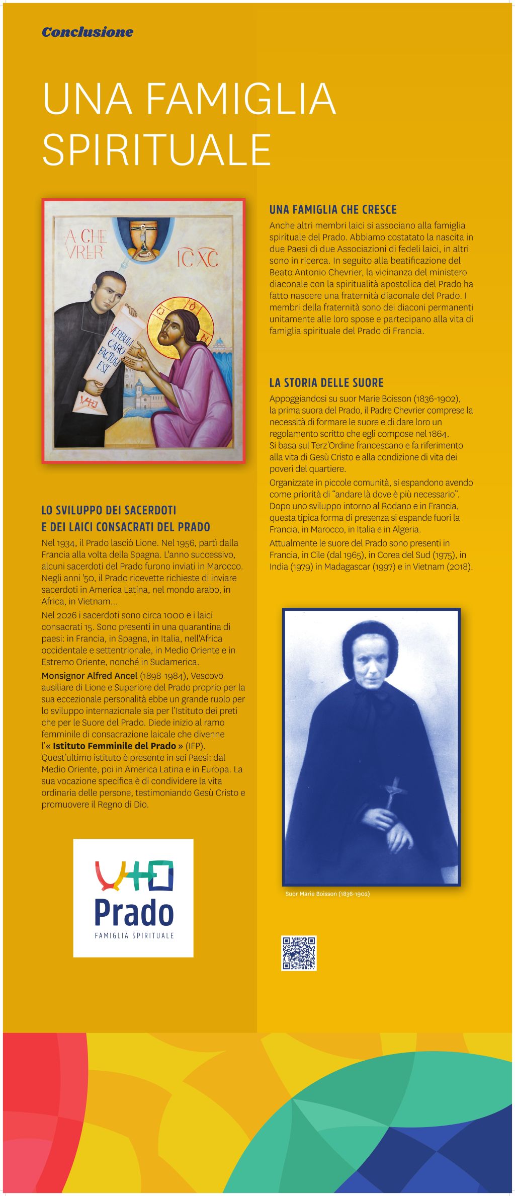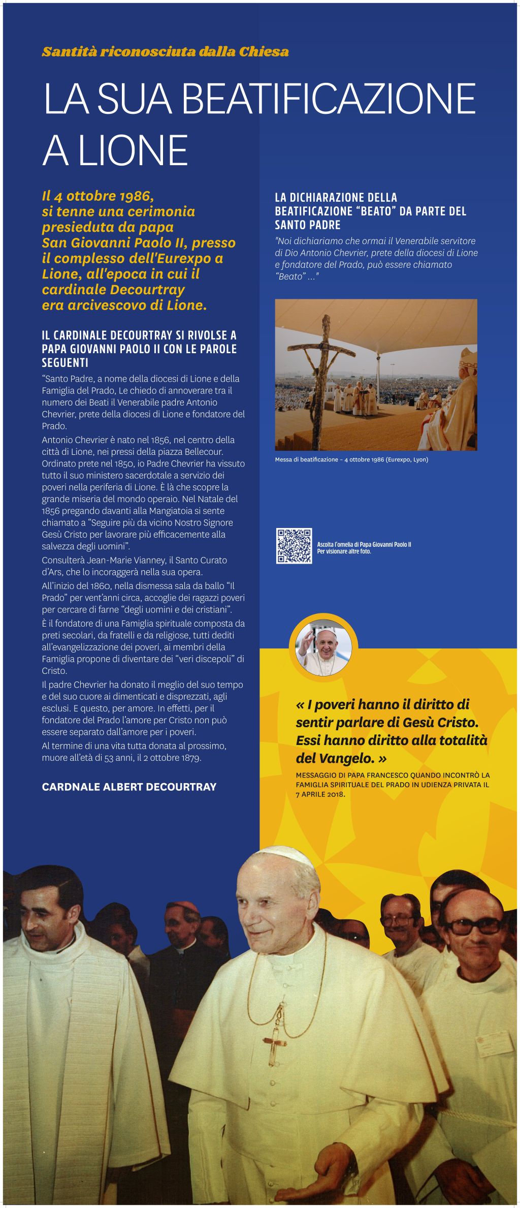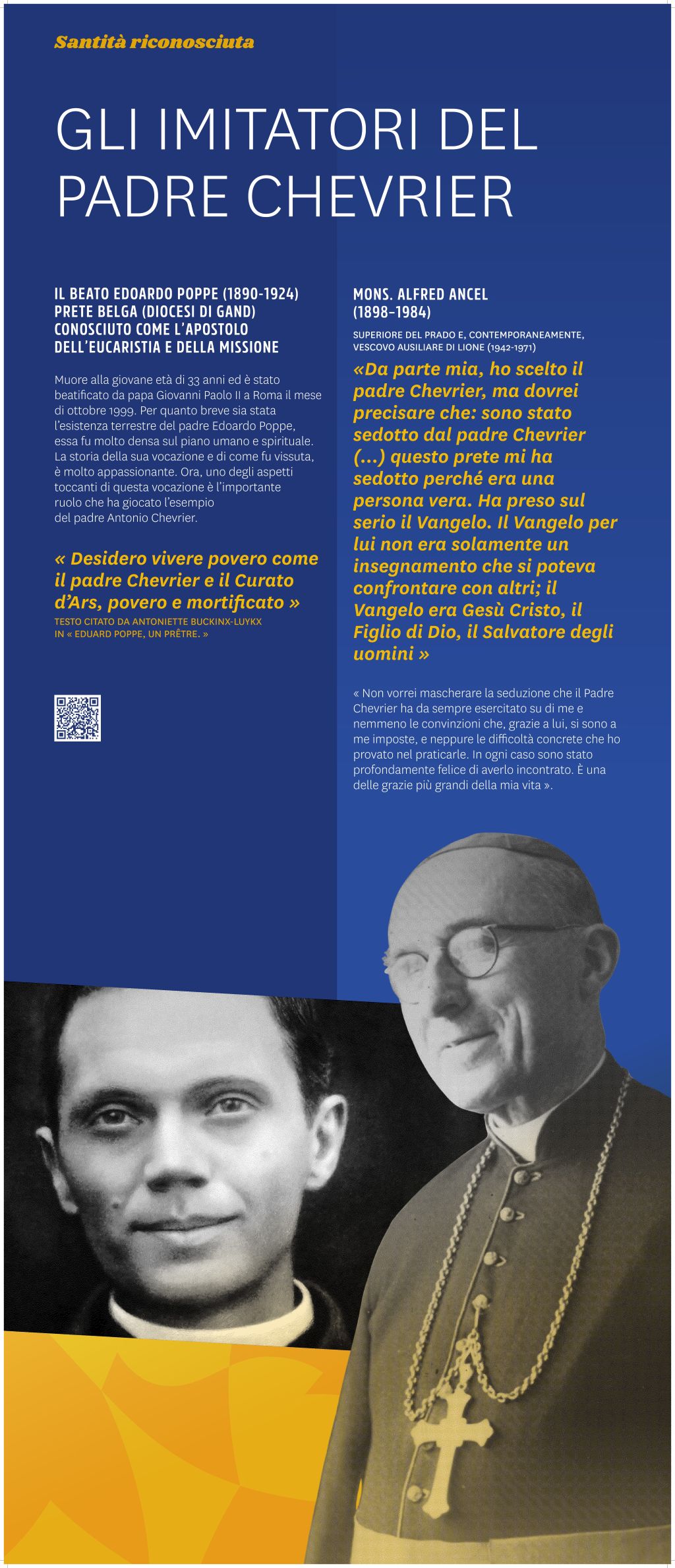 I pannelli sono associati a codici QR che vi consentono di approfondire ulteriormente ogni tematica. Scoprirete ad esempio video o sequenze audio inedite (omelia del Papa, podcast della Famiglia del Prado…) o ancora i percorsi di altre figure pradosiane come Manuel PIMENTEL (Portogallo), Joseph FOLLIET (Francia), Mons. Youssef Anis ABI AAD (Libano/Siria), Michel LEBORDAIS (Francia/Egitto), Joseph Marie GJISHIK (Polonia/Egitto), Raimundo SOARES (Brasile), S. DUQUE (Colombia), Christian DELORME (Francia) o Marcelle SEMIN (Francia).