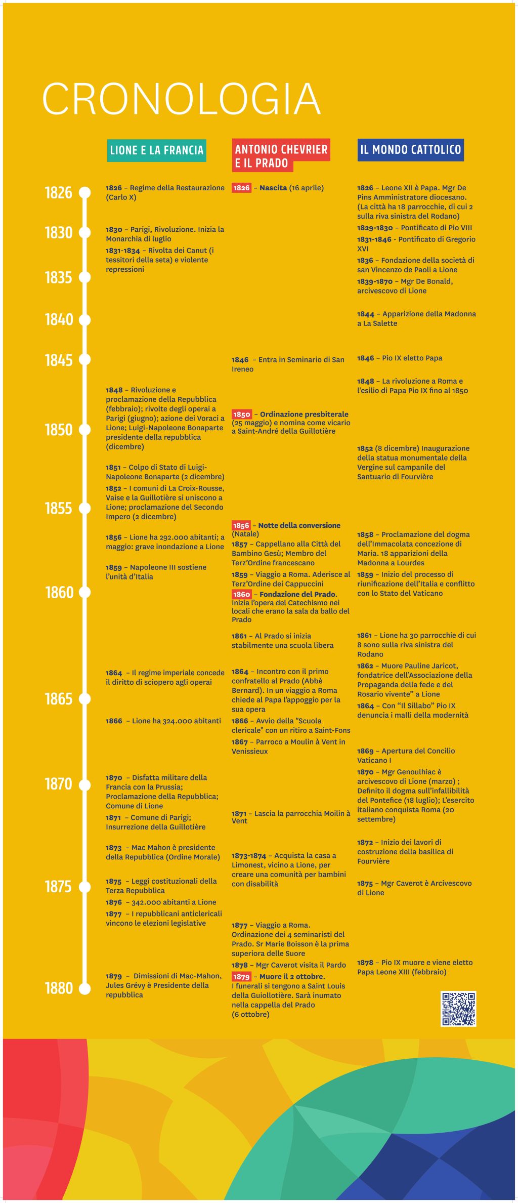 Una « Cronologia » che mette in evidenza gli eventi salienti della vita di Antoine Chevrier, a Lione e in Francia, nonché nel mondo cattolico, vi permetterà di comprendere meglio il percorso e l’opera del Beato.