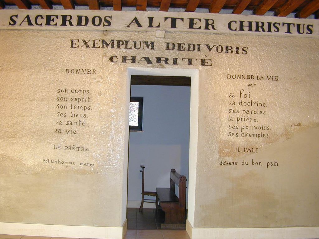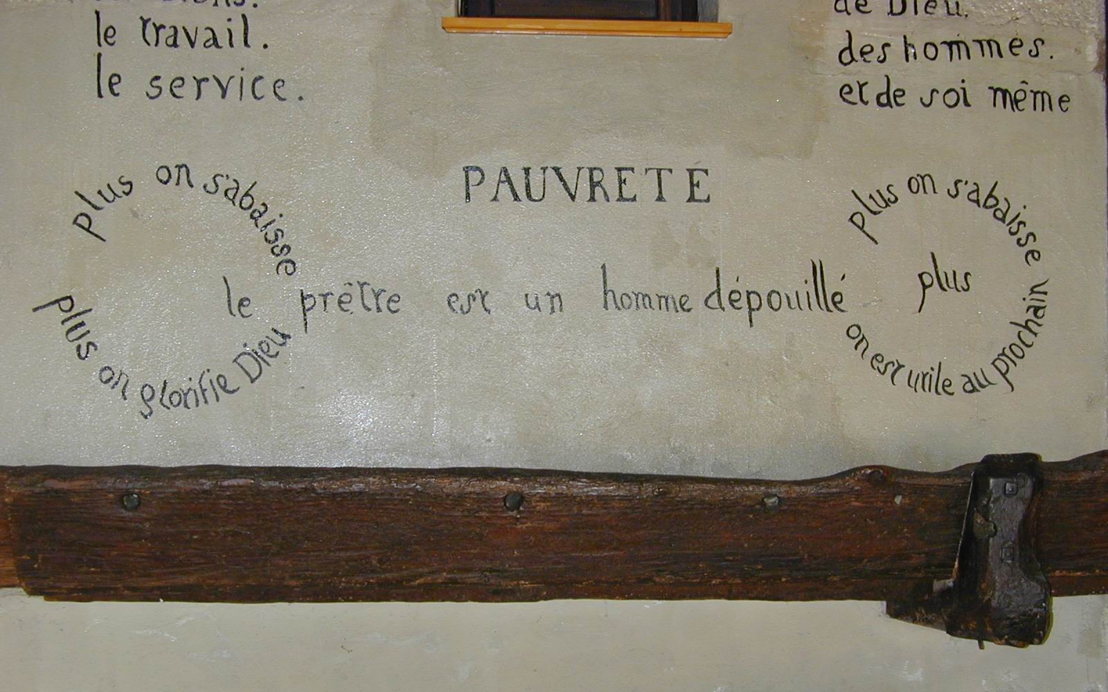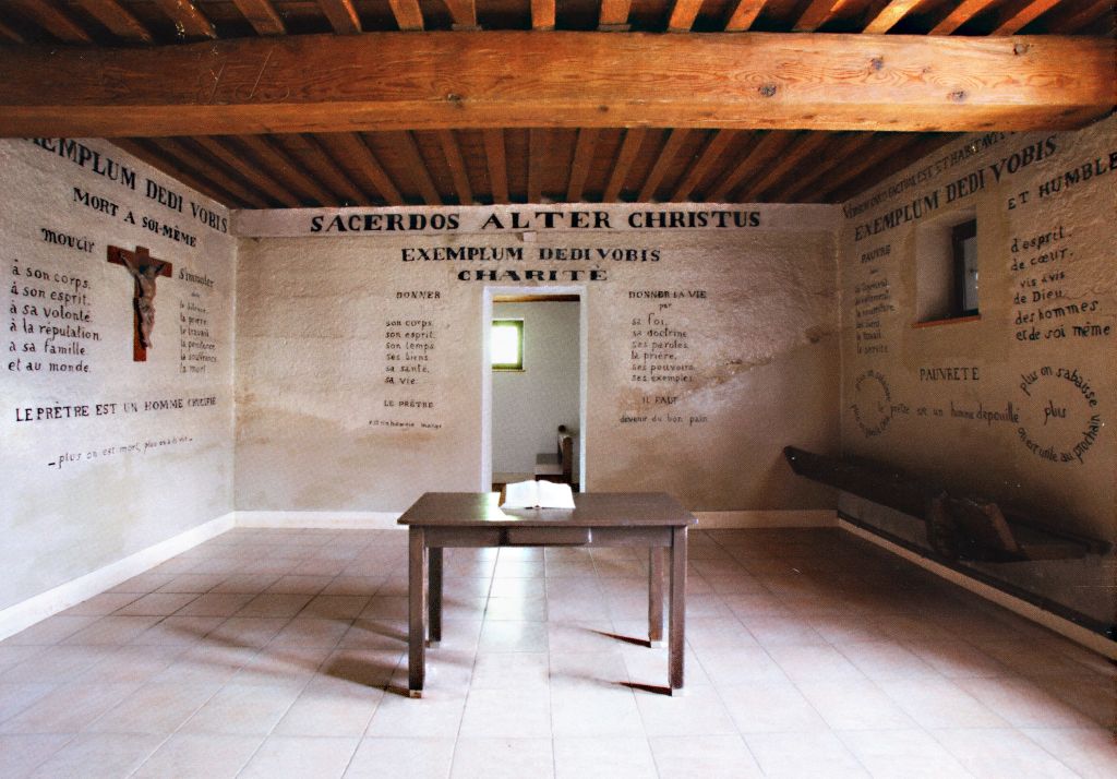 En aout 1866, le Père Chevrier conduit un groupe de 12 séminaristes pour une retraite dans ce lieu pour leur présenter son « idéal » sacerdotal. Selon les témoins qui racontent ce jour-là, le P. Chevrier peint directement avec un pinceau sur les murs, les mots qui y resteront, disposés sur trois murs, en utilisant d’une façon créative la crèche déjà présente, la porte du cabanon d’outil et en répartissant en colonnes quelques points saillants qui se déclinent en trois grands chapitres : la crèche, la croix, le tabernacle.